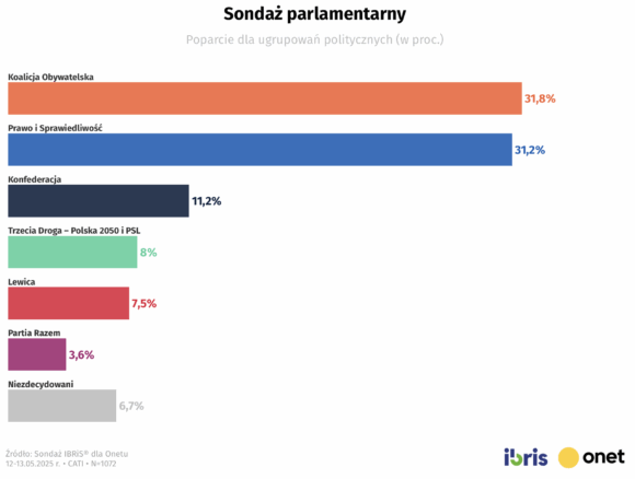 Última encuesta: Una encuesta de IBRiS de mayo de 2025 muestra a Coalición Cívica con un 31,8%, PiS con un 31,2% y Confederación con un 11,2%.