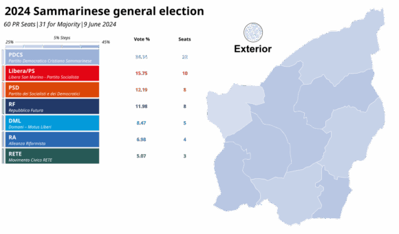 Situación política: San Marino, gobernado por una coalición de PDCS y RETE desde 2019, mantiene estabilidad. Las elecciones serán en 2029.