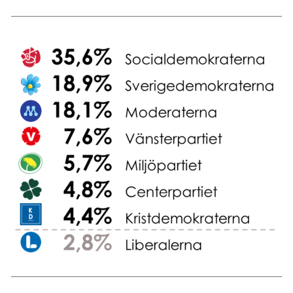 Última encuesta: Una encuesta de Verian de mayo de 2025 muestra a los socialdemócratas claramente en cabeza con un 35,6%, Moderados con un 19,1% y Demócratas de Suecia con un 18,9% luchan por la segunda plaza.