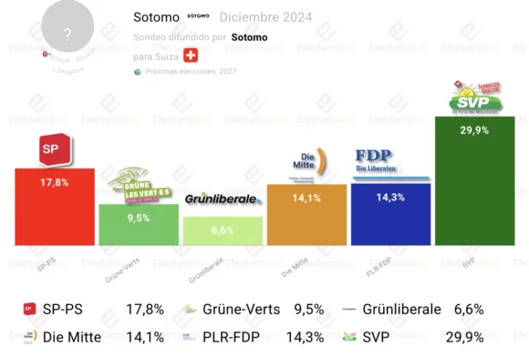Última encuesta: Una encuesta de Sotomo publicada en diciembre de 2025 muestra a SVP con cerca del 30%, SP con un 17,8% y FDP con un 14%.