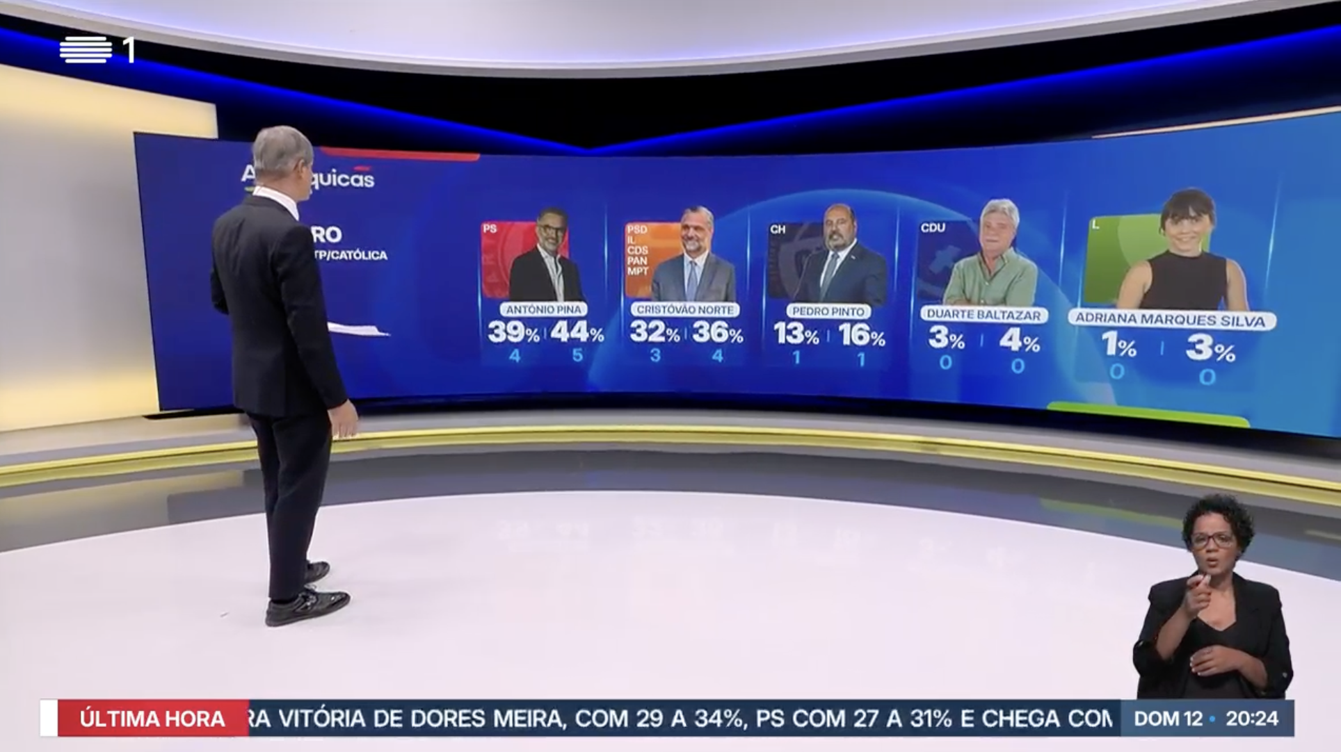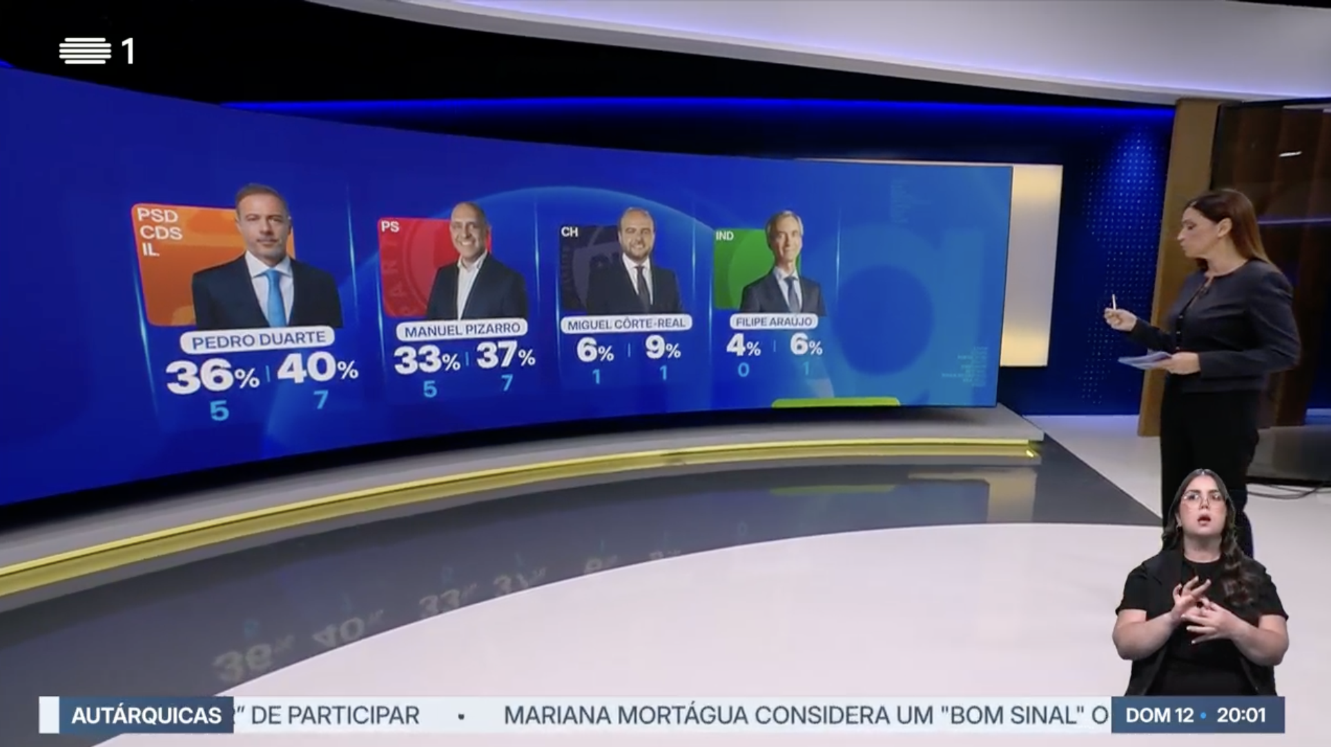 Chega logra entre 6% y 9%, mientras que la candidatura independiente de Filipe Araújo (antiguo vicealcalde) se sitúa entre 4% y 6%, un resultado más discreto del esperado. El PSD podría alcanzar entre 5 y 7 concejales, frente a los 5 a 7del PS.