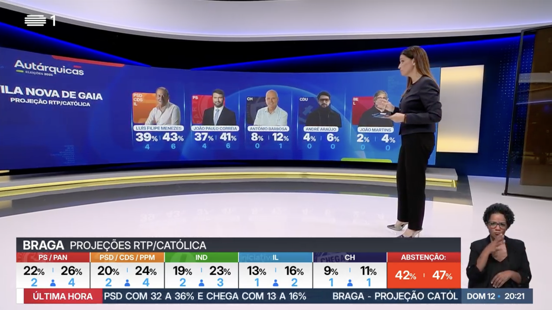 En Vila Nova de Gaia, las estimaciones ubican una ligera ventaja para la coalición PSD–CDS–IL, con entre 39 % y 43 %, frente al 37 %–41 % del PS.