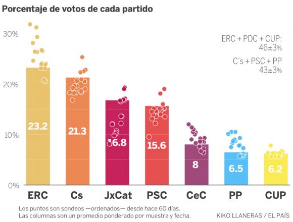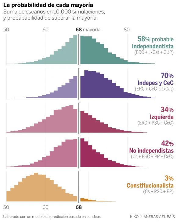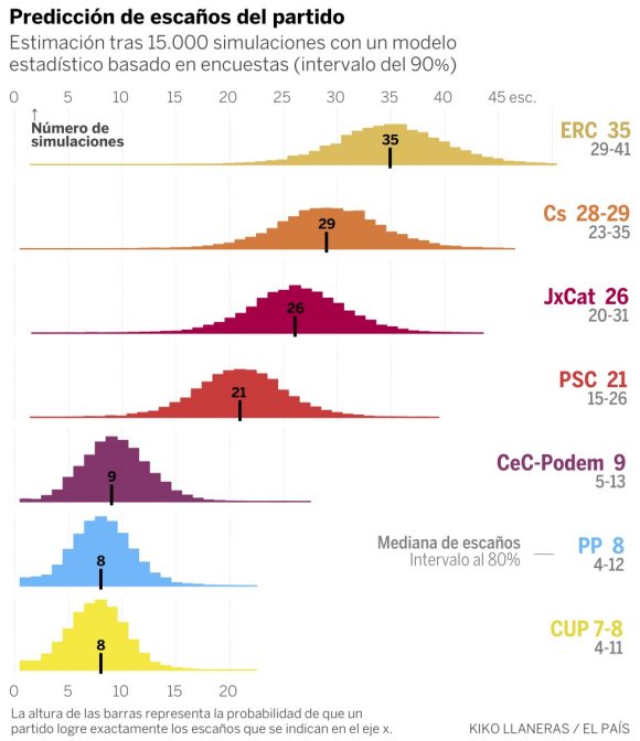 Predicción de Kiko Llaneras publicada en El Pais para las elecciones en Cataluña, a partir de los sondeos y la realización de 10.000 simulaciones electorales (método estadístico predictivo):