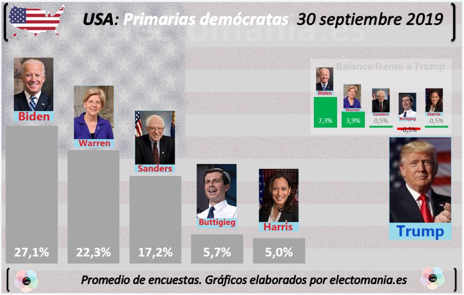 El 12 de septiembre se celebraron los terceros debates, en Houston (Texas). Desde entonces lo más destacado es la progresión de Elizabeth Warren, que incluso llegó a igualar a Joe Biden. Después, tras los debates celebrados en Westerville (Ohio) el 15 de octubre, Warren ha retrocedido un poco. Harris sigue perdiendo fuelle y ha sido superada por Buttigieg, que gana algunos puntos, al igual que Bernie Sanders.