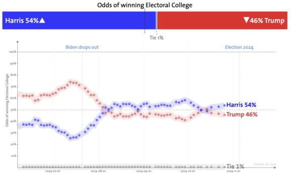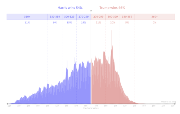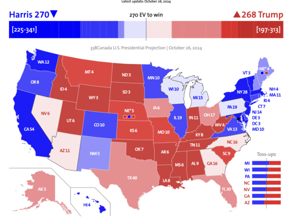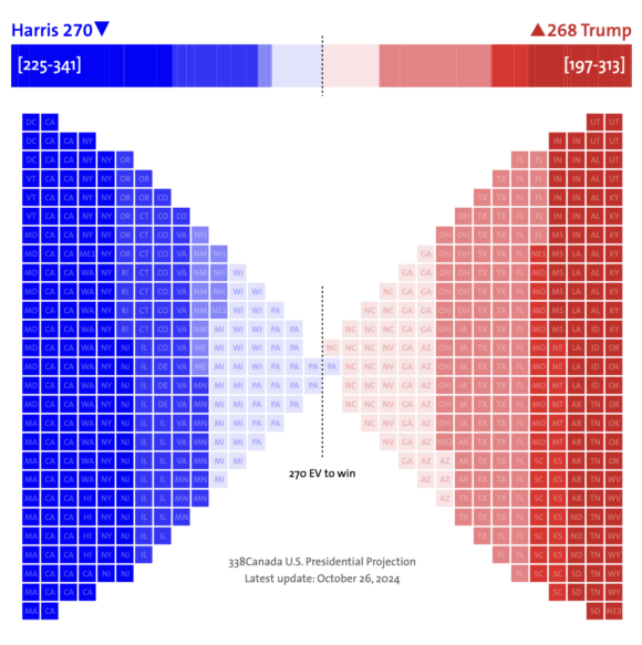 La más reciente proyección electoral de 338Canada, actualizada al 26 de octubre de 2024, presenta un panorama ajustado para las elecciones presidenciales de EE. UU. La demócrata Kamala Harris obtiene 270 votos electorales, lo justo para asegurar la presidencia, frente a los 268 votos proyectados para el republicano Donald Trump.