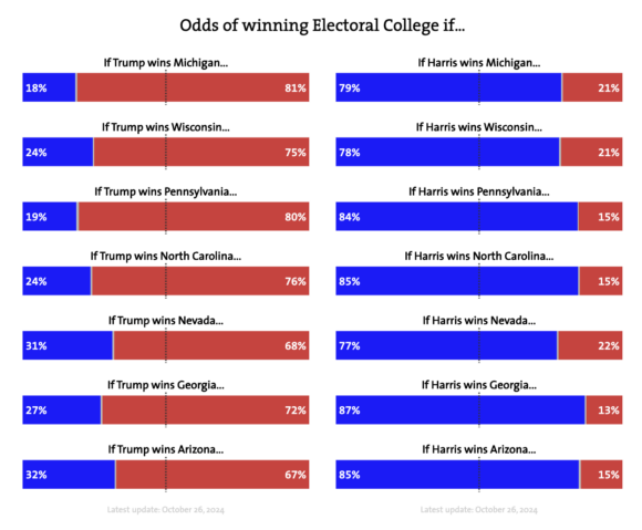 - Toss-ups: Los estados de Michigan (MI), Wisconsin (WI), Pensilvania (PA), Nevada (NV), Georgia (GA) y Arizona (AZ) aparecen como indecisos, lo que indica que la elección está lejos de ser segura para ninguno de los candidatos.