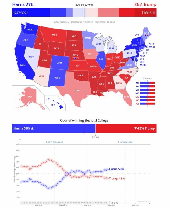 La más última proyección presidencial para las elecciones de EE.UU. del 2024, publicada el 28 de septiembre, muestra a la actual vicepresidenta Kamala Harris con una ventaja significativa sobre el expresidente Donald Trump en el Colegio Electoral. Según los datos, Harris alcanzaría 276 votos electorales, mientras que Trump se quedaría con 262, ambos dentro de un margen muy ajustado.