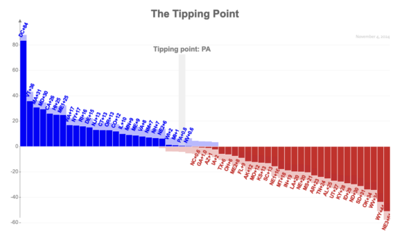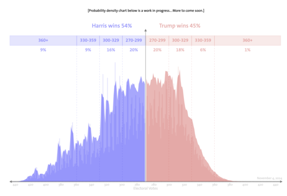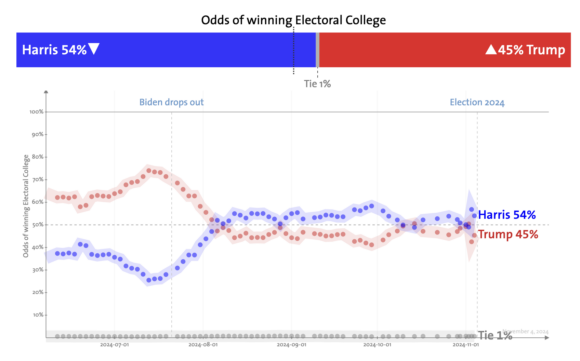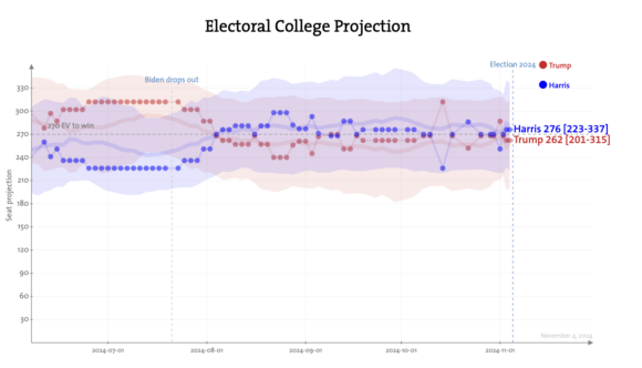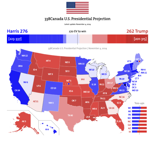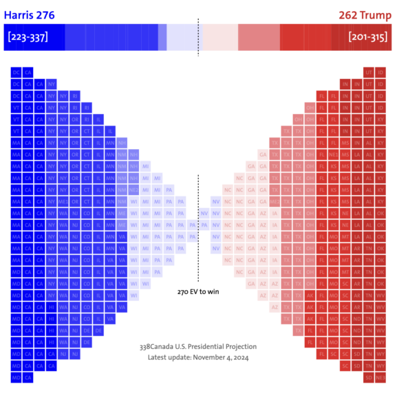 La proyección de la elección presidencial de EE.UU. al 4 de noviembre de 2024, realizada por 338Cn, muestra una ligera ventaja para Harris sobre Trump con 276 votos electorales proyectados frente a 262 para Trump, superando el umbral de 270 necesario para ganar. Las probabilidades de Harris de ganar el Colegio Electoral se sitúan en un 54%, mientras que Trump tiene un 45%.