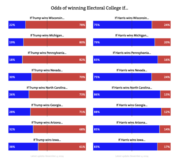 Los estados clave o “toss-ups” incluyen Wisconsin, Nevada, Carolina del Norte, Georgia, Arizona e Iowa. La proyección revela que si Trump gana en estados como Michigan o Pennsylvania, sus probabilidades aumentarían significativamente. Por otro lado, una victoria de Harris en estos estados consolidaría aún más su ventaja. Este análisis muestra un panorama competitivo y muy ajustado para ambos candidatos.