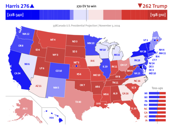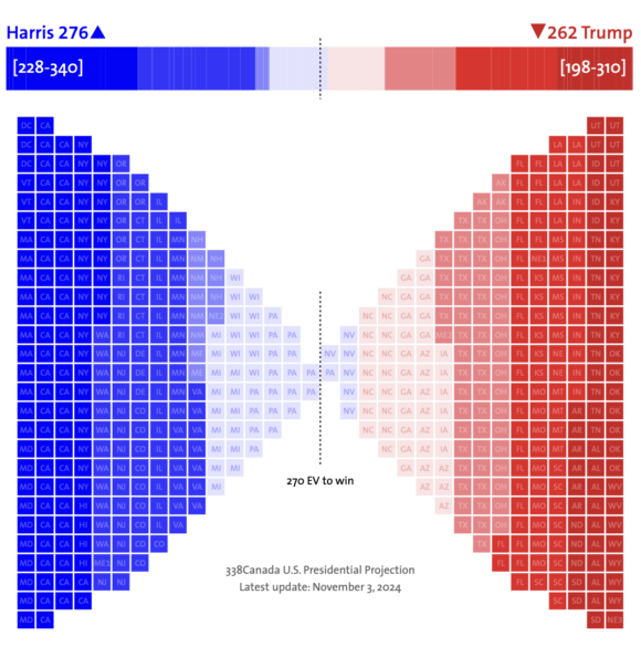 La proyección electoral del 3 de noviembre de 2024 muestra una carrera cambiante entre Kamala Harris y Donald Trump, con Harris liderando con un 276 de votos electorales frente a 262 para Trump.