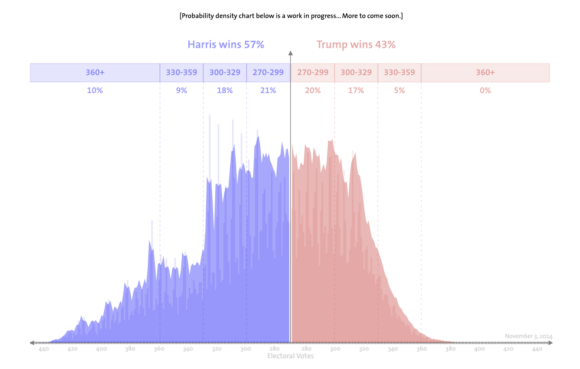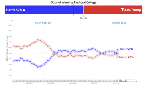 La probabilidad de que Harris gane la mayoría de Colegios Electorales es del 57%, mientras que Trump se sitúa en un 43%.