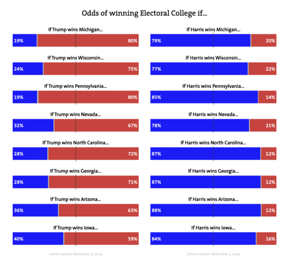Los datos destacan que, si Trump gana en estados clave como Michigan, Wisconsin o Pennsylvania, sus probabilidades de éxito aumentan considerablemente, alcanzando hasta un 80%. Por otro lado, si Harris asegura esos estados, su ventaja se refuerza con probabilidades de hasta el 85%.