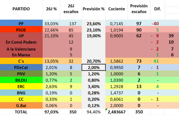 Tras conocer en el día de hoy el sondeo de GAD3 para ABC de cara a elecciones generales, en electomanía hemos actualizado nuestra electocalculadora a una versión 4.0 que se basa en los resultados del pasado 26J para calcular la estimación de escaños a partir de porcentajes.
