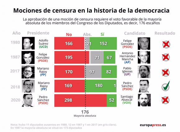 Infografía con resultado de las mociones de censura en la historia de la democracia