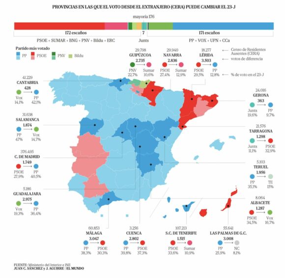 Los votos CERA y ERTA serán contados a partir de hoy viernes 28 de julio y antes del martes 1 de agosto. Las Juntas Electorales Provinciales concluirán el escrutinio general, incluyendo las papeletas emitidas por los 2,3 millones de españoles que residen en el extranjero y están inscritos.