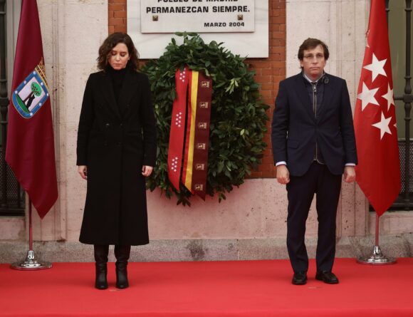 Ha sido entonces cuando durante dos minutos han sonado al unísono, como cada año, las campanas de las iglesias de la Comunidad de Madrid y cuando la presidenta de la Comunidad, Isabel Díaz Ayuso, y el alcalde, José Luis Martínez-Almeida, han depositado una corona de laurel a los pies de la placa, mientras la Orquesta y Coro de la Comunidad de Madrid ha interpretado ‘Adagio for Strings’ de Samuel Barber.