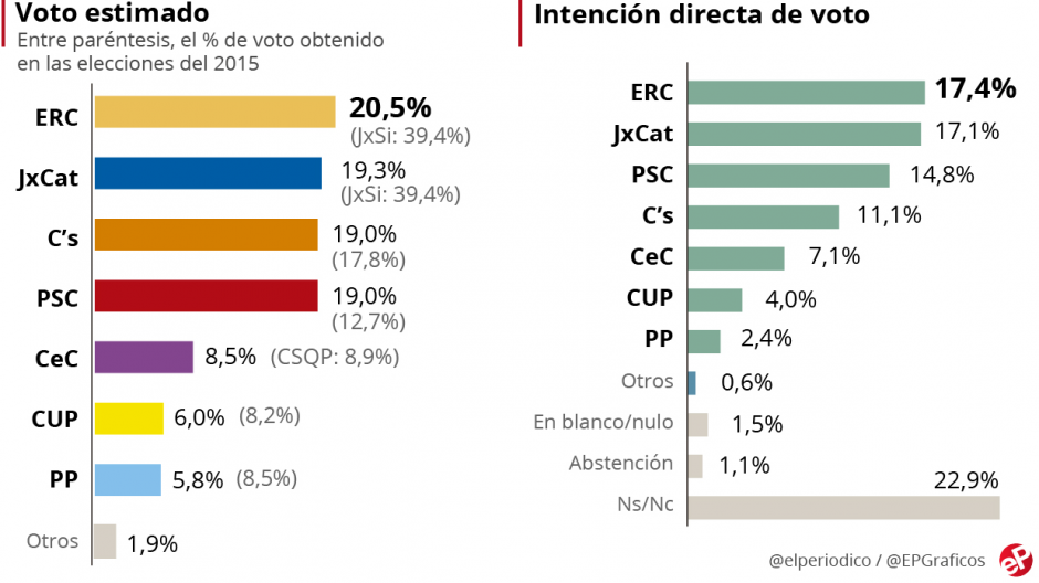 Se produce un cierto avance en escaños de los partidos constitucionalistas, de manera que la mayoría independentista queda en el aire (estos partidos obtendrían entre 66 y 69 escaños), cuando en el sondeo de noviembre GESOP la daba por segura.