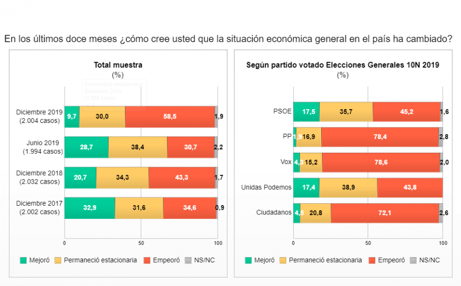 En cuanto al balance final de 2019, la opinión social ha empeorado notablemente respecto a la existente en junio. Las visiones negativas pasan de poco más de un 30% a casi un 60%. No obstante, hay notables diferencias entre grupos: los jóvenes y los votantes de partidos de izquierdas son mucho menos negativos que los mayores y los votantes de derechas.