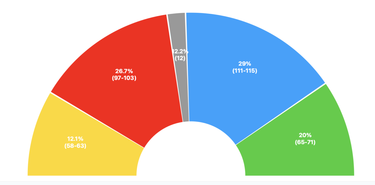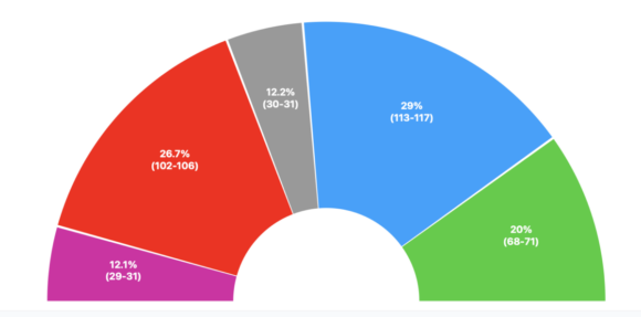 Por último, sin ningún tipo de alianza, el PP sería el más votado con 29,4% (118–121), el PSOE lograría 27% (106–109), Vox 20,3% (73–77), Sumar apenas 11 escaños (7,2%) y Podemos 2 (3,8%).