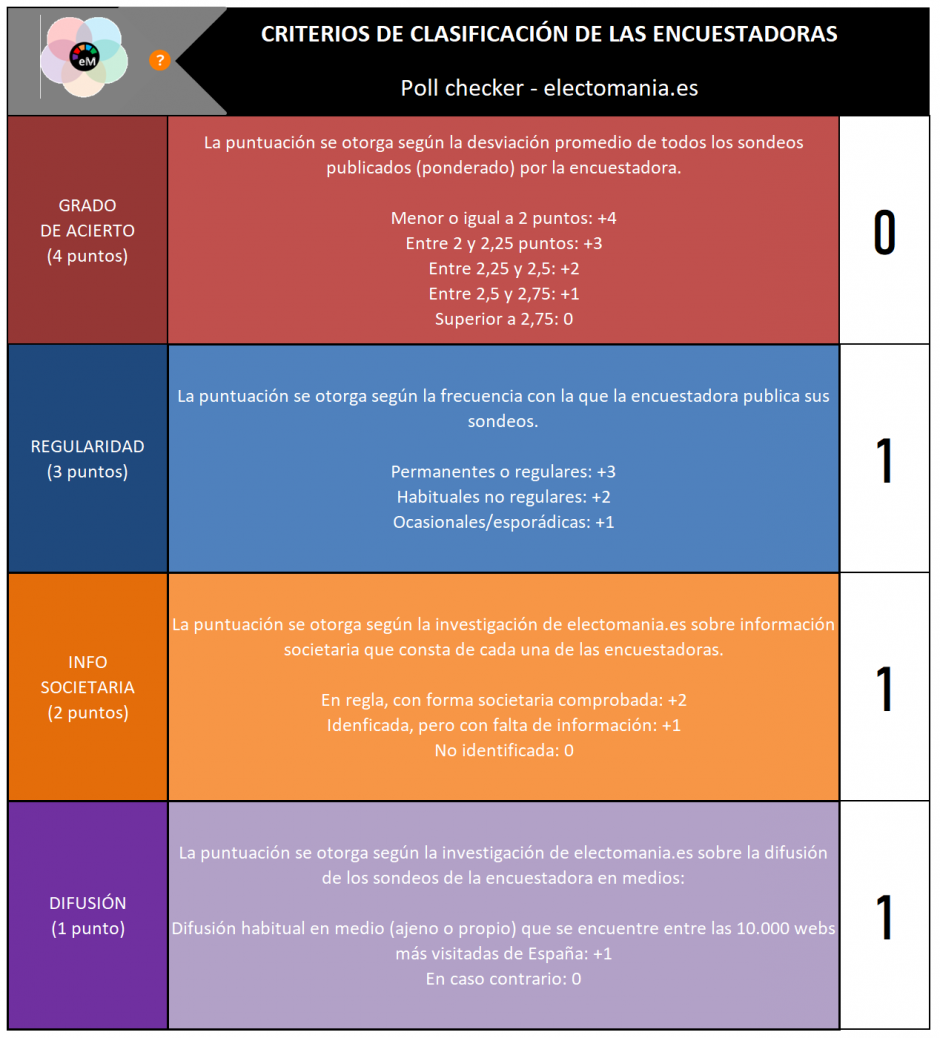 [En electomania.es hemos llevado a cabo una revisión de los criterios objetivos que clasifican a las encuestadoras en el Poll Checker y creemos que sí es publicable, aunque entra en la categoría de encuestadoras ‘dudosas’, ya que la empresa que la elabora lleva constituida muy pocos meses y apenas hay regularidad en su publicación o información societaria y sobre el método de trabajo]