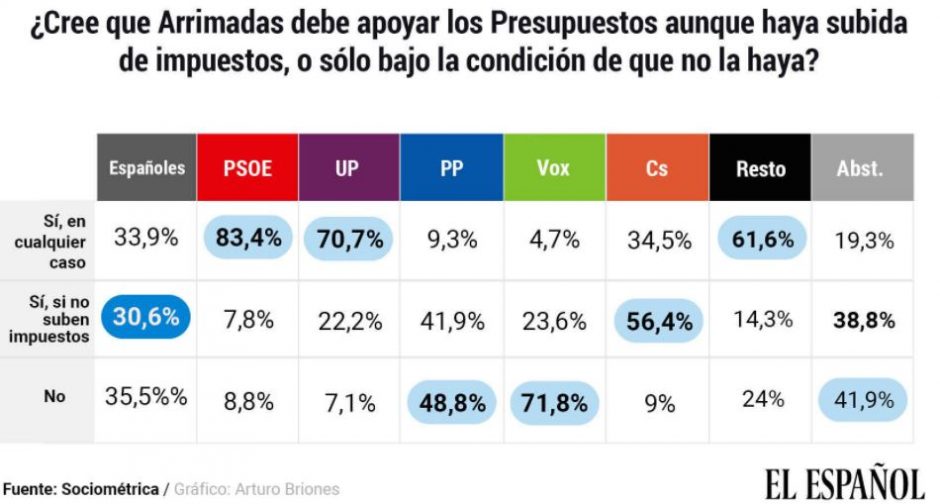 El conjunto de la sociedad (y, mucho más, los propios votantes de Ciudadanos) apoya la decisión de negociar los presupuestos con el gobierno. En cuanto al contenido de los presupuestos, los votantes del partido de Arrimadas los apoyarían solo si no hay subida de impuestos.