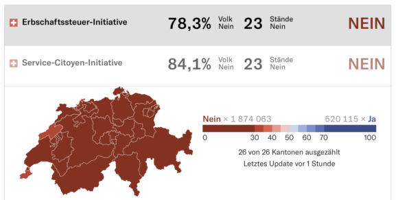 Los suizos han rechazado hoy de forma muy clara las dos iniciativas sometidas a votación federal: la nueva tasa federal sobre grandes herencias y donaciones, y la “Service‑Citoyen‑Initiative” para ampliar el servicio nacional obligatorio. En ambos casos el “Nein” se impuso en todos los cantones, con márgenes superiores al 75% del voto popular, lo que supone una de las derrotas más contundentes de los últimos años en la democracia directa helvética.