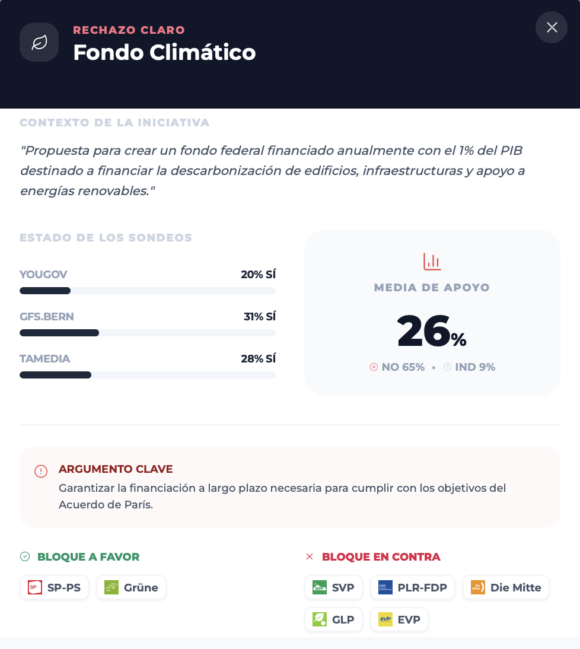 La propuesta refleja nítidamente la clásica fractura climática de la política suiza: PS, Verdes y la izquierda alternativa recomiendan votar a favor, mientras que UDC, PLR/FDP, Centro y UDF/EDU piden el “no”; el PVL/GLP, pese a su perfil verde‑liberal, también se posiciona contra el texto por considerar el instrumento financiero demasiado rígido. Esta alineación deja el sí apoyado sobre todo en la izquierda urbana y en las regiones de tradición progresista, mientras las fuerzas de centro‑derecha dominantes en el Mittelland y la Suiza rural empujan en sentido contrario.