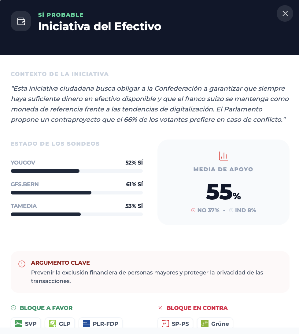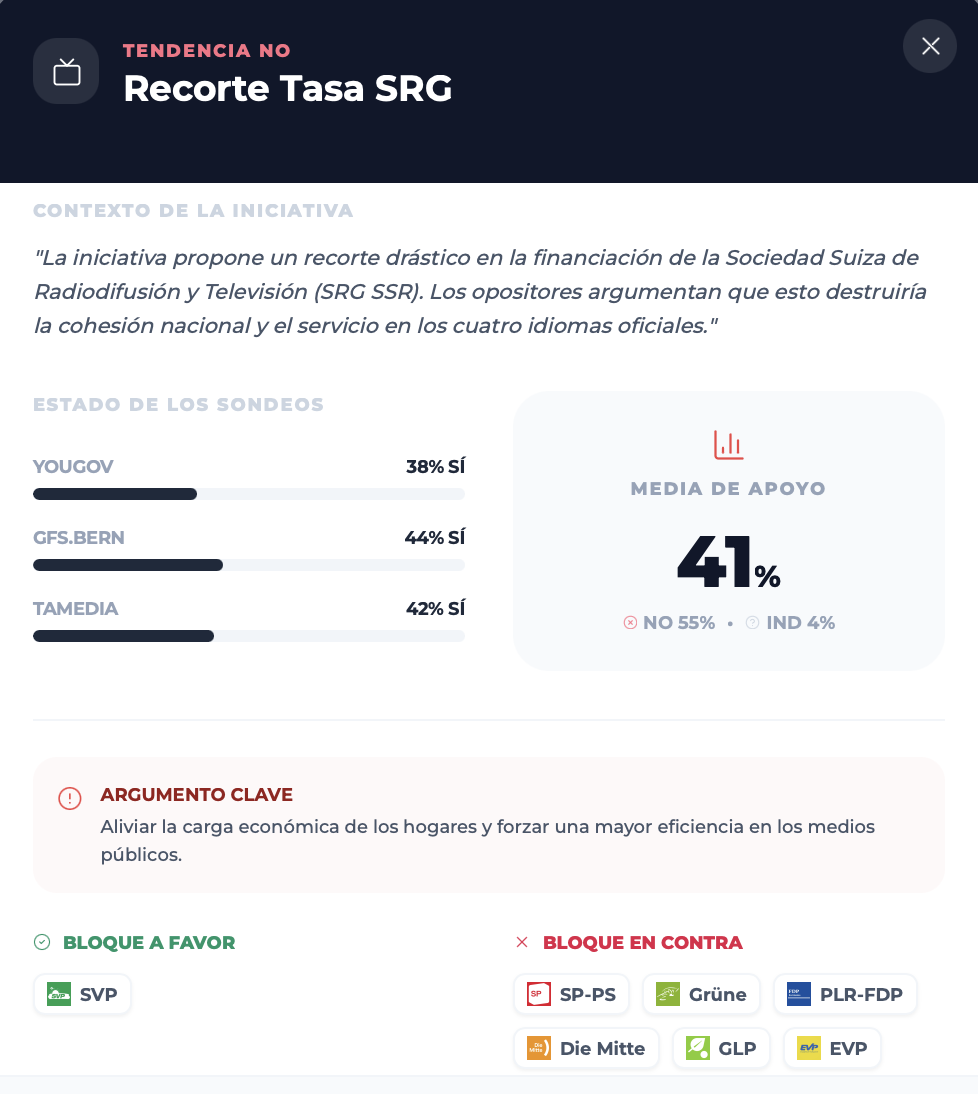 En el frente demoscópico, la iniciativa es claramente la más debilitada de todas. El barómetro de YouGov la sitúa en torno al 36% de apoyo y un 59% de rechazo, con una mayoría negativa en casi todos los cantones. Las últimas mediciones de Tamedia/LeeWas apuntan a un “no” cercano al 65%, y el tracking de gfs.bern habla igualmente de una “mayoría clara contra la iniciativa”, lo que obliga a sus promotores a aspirar más a limitar la derrota que a una remontada completa en las últimas semanas.