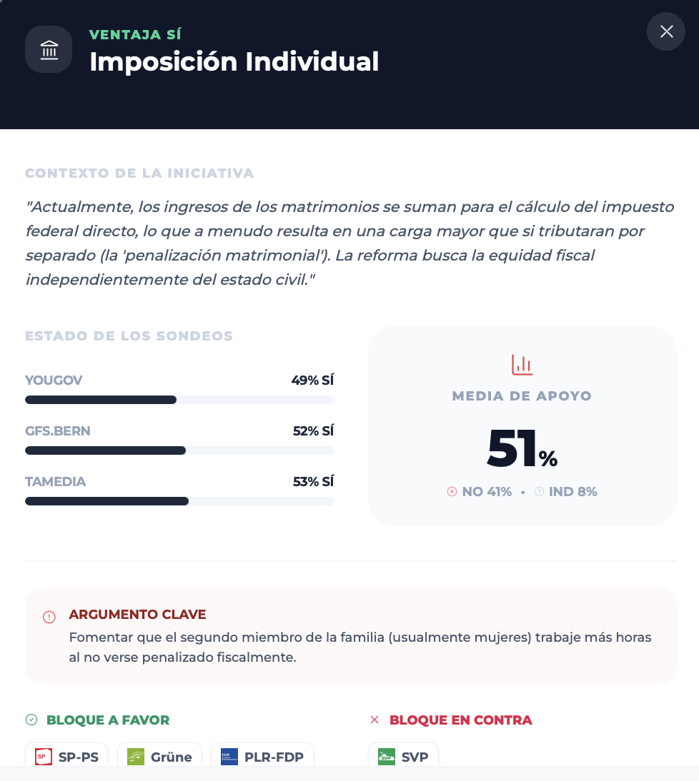 El cuarto objeto en las urnas es un referéndum legislativo sobre la nueva Ley federal de imposición individual, que pone fin a la tributación conjunta de los matrimonios y pasa a gravar por separado a cada contribuyente, con la idea de eliminar la “penalización del matrimonio” y mejorar los incentivos al empleo, especialmente para las segundas rentas del hogar. El Parlamento aprobó la reforma en 2025, pero un referéndum facultativo impulsado por sectores conservadores exige ahora la ratificación en las urnas.