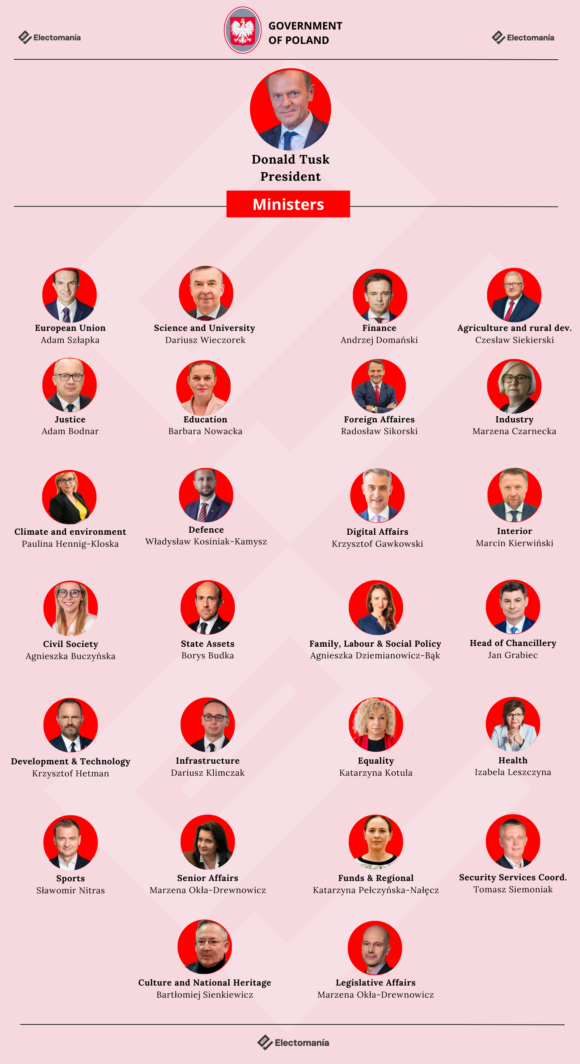 Donald Tusk, retomando el cargo de Primer Ministro, trae consigo una vasta experiencia y un historial probado en la política europea y nacional. A su lado, Władysław Kosiniak-Kamysz, como Viceprimer Ministro y Ministro de Defensa, y Krzysztof Gawkowski, también Viceprimer Ministro y Ministro de Asuntos Digitales, complementan el liderazgo con sus especializaciones en seguridad nacional y tecnología, respectivamente.