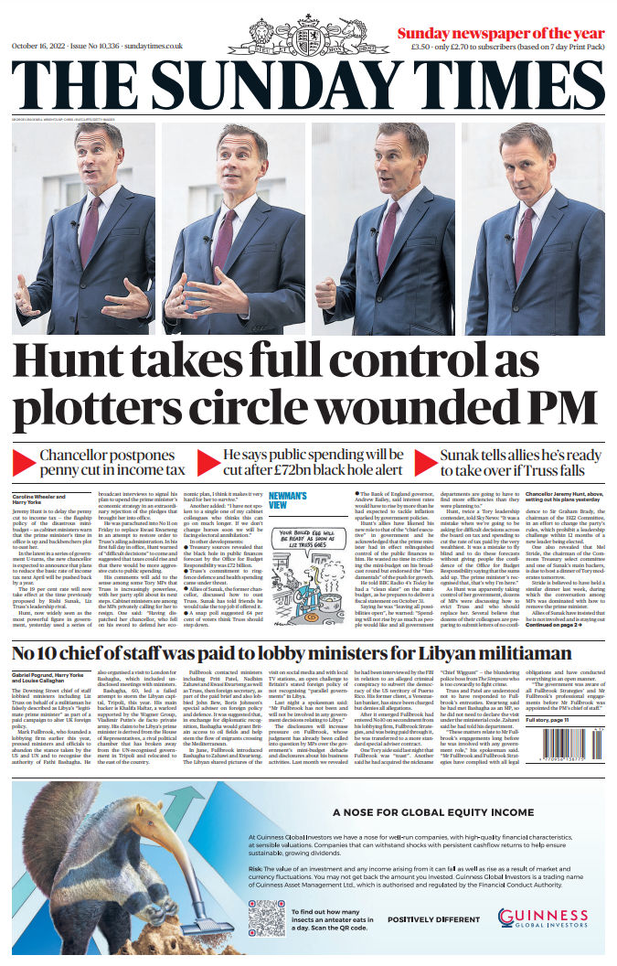 “Jeremy Hunt retrasará el recorte de impuestos, tras la advertencia de los miembros del gabinete de que el tiempo de la Primera Ministra ha terminado y los diputados planean destituirla”.