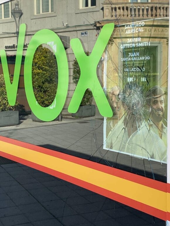 La sede de campaña de la formación política VOX en Valladolid ha amenecido este domingo, “por segundo día consecutivo”, dañada por diferenes actos de “vandalismo” como pintadas y roturas de cristales en su sede de la calle Santiago de la capital.