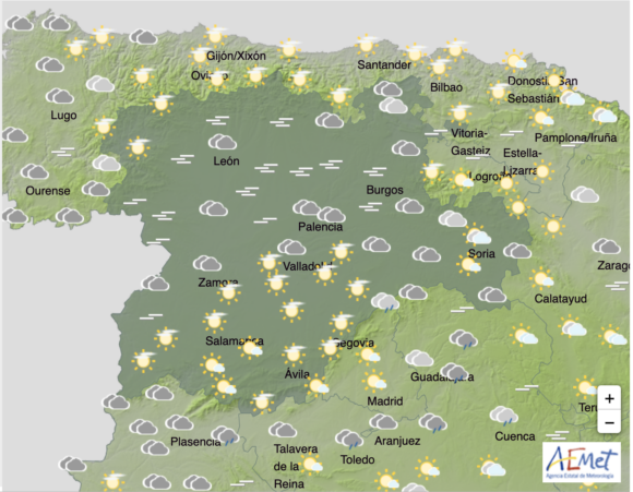 La probabilidad de lluvia a lo largo del día rozará el 100% en casi toda la región (o regiones), si bien no se esperan grandes tormentas. Así amanecía Castilla y León, según datos de la AEMET: