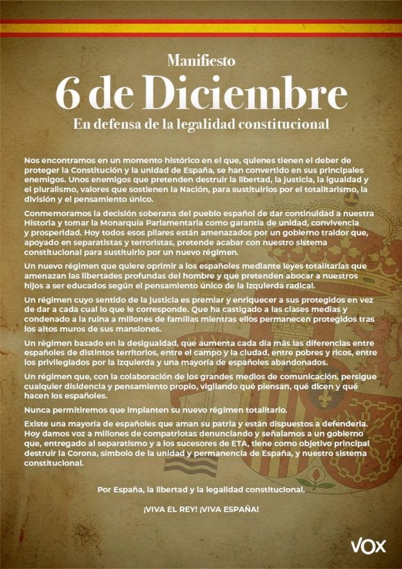 Vox llama a llenar las calles el 6-D contra el gobierno “traidor” que atenta contra el orden constitucional