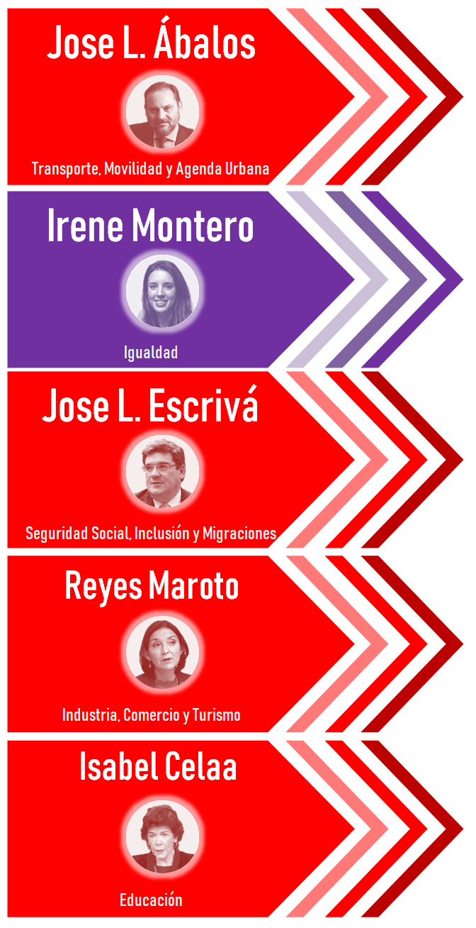 Por su parte, entre las filas del PSOE los nuevos perfiles incorporados al ejecutivo tienen un carácter más tecnócrata, seguramente para contrarrestar el peso político de Unidas Podemos con nombres prácticamente desconocidos que, a priori, posean prestigio dentro de sus respectivos campos.