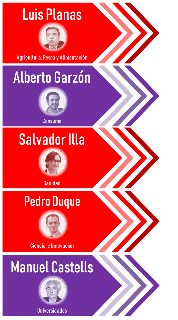 Las carteras de Unidas Podemos (ocupadas por Pablo Iglesias, Irene Montero, Alberto Garzón, Yolanda Díaz y Manuel Castells) tienen un fuerte carácter social y son una apuesta de la formación morada por un perfil fuertemente político al frente de sus Ministerios.