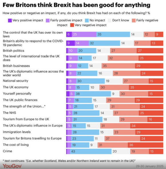 Un sondeo de YouGov, realizado entre el 29 y 30 de enero de 2025, ha arrojado luz sobre la percepción que tienen los británicos sobre los efectos del Brexit, y los resultados no son alentadores para sus defensores. La encuesta, que evalúa el impacto de la salida del Reino Unido de la Unión Europea en diversos aspectos de la vida nacional, revela un panorama de insatisfacción generalizada y dudas sobre los beneficios prometidos por los partidarios del Brexit.